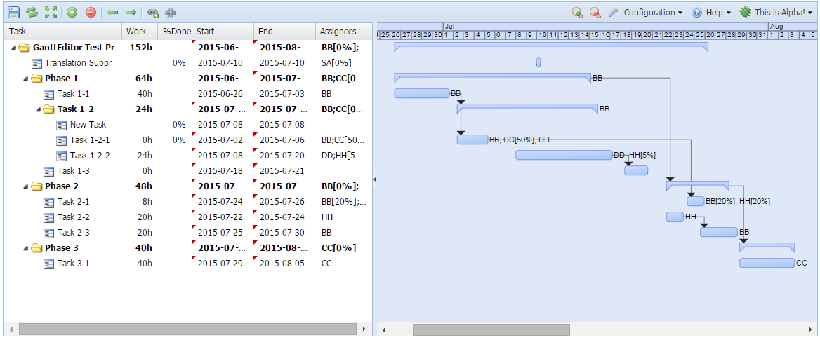 The Gantt editor uses the Sencha ExtJS HTML5 JavaScript library as a base. The Gantt editor follows the Sencha Model-View-Controller development conventions and implements the application as a number of panels, views, controllers, stores and models. The backend provides information about projects, tasks, users via a Rest API.